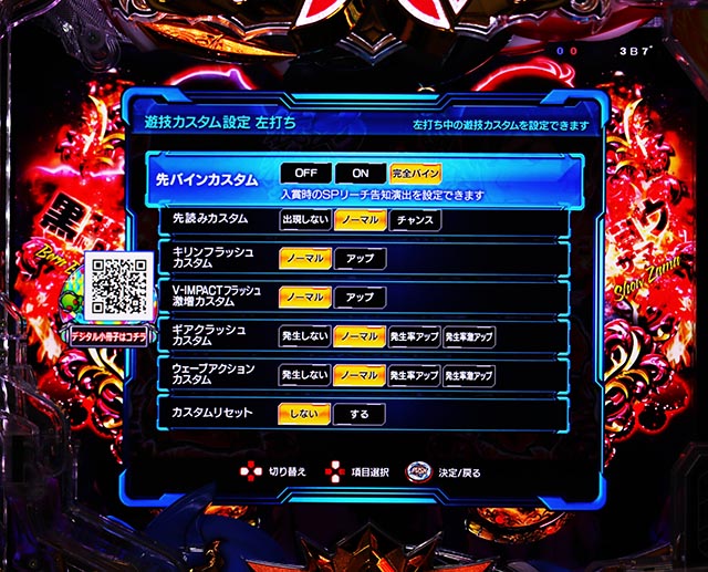 遊技待機中のメニュー画面から、各カスタムを設定できる。