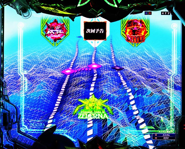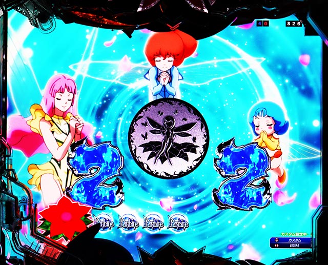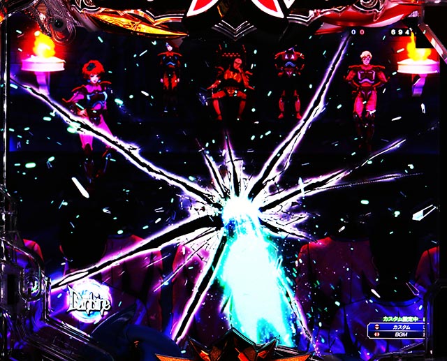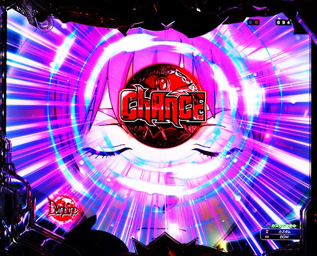 当カスタムではヘソチャッカーに玉が入賞したときにSEが鳴り、枠サイドランプが発光すると先バイン演出がセットされる。その際はSPリーチ発展濃厚となる役割がある。