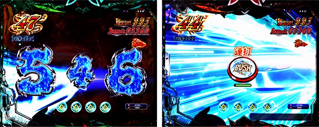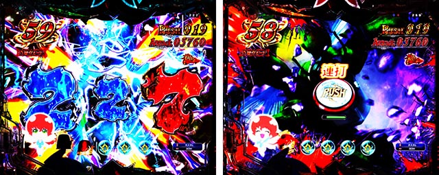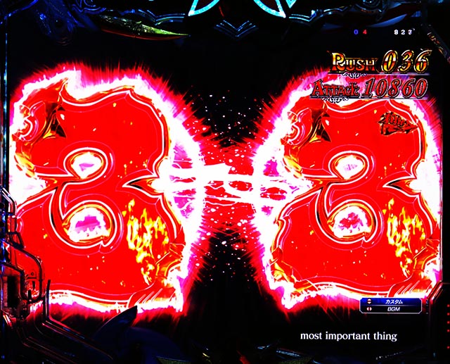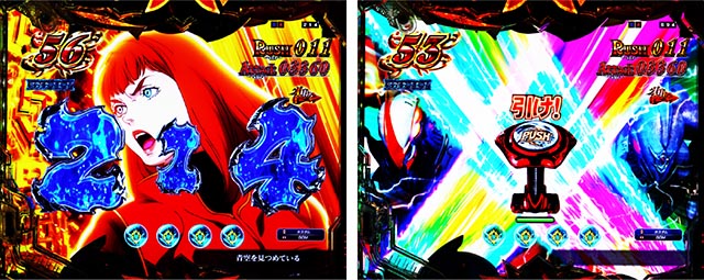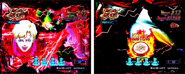 レバーは鬼アツで、初代でも用いられていた上写真の旧赤大ボタンは大当り濃厚だ。