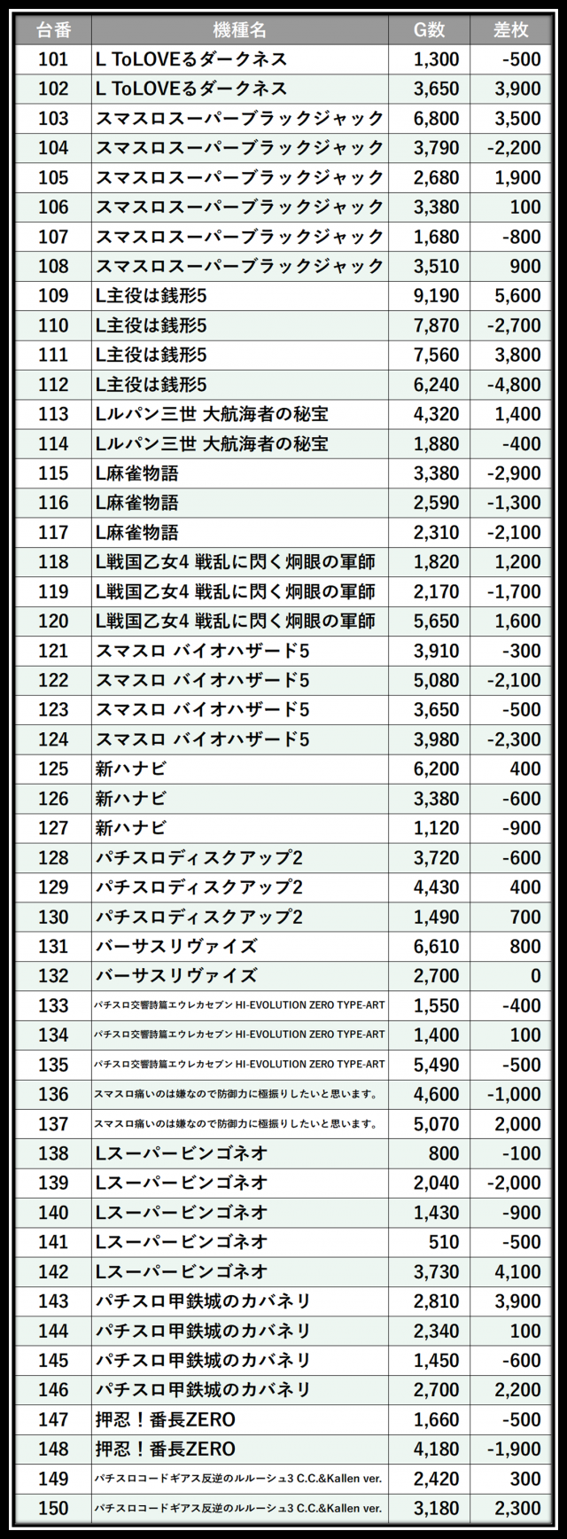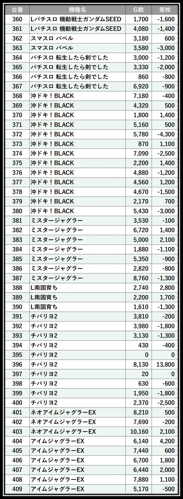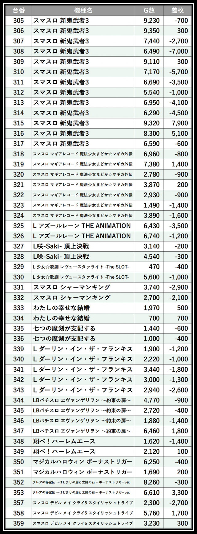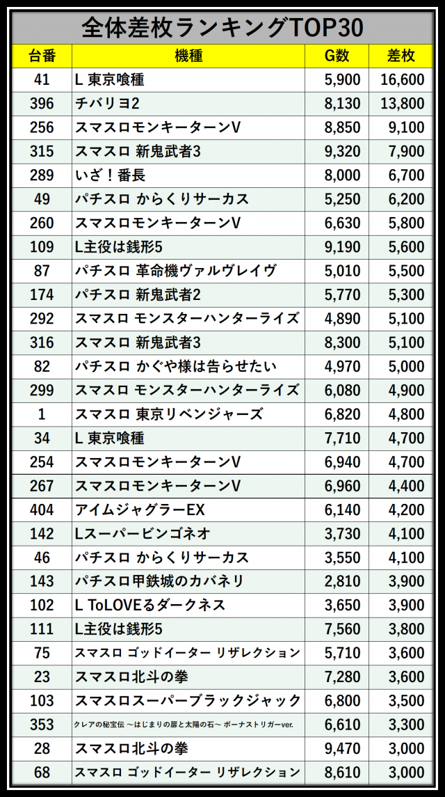 ※差枚数順に掲載しています