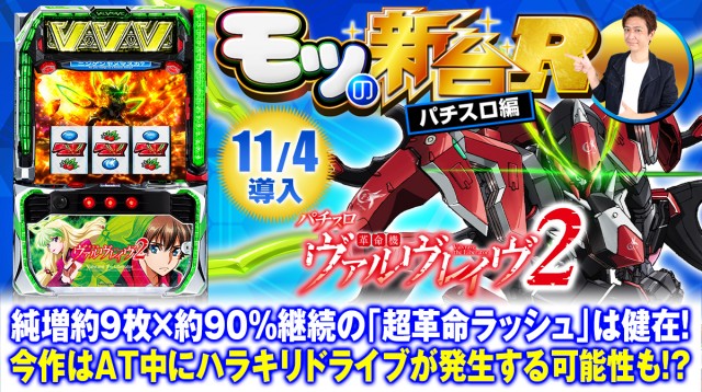 スマスロ界に旋風を巻き起こした名機の最新作『Lパチスロ 革命機ヴァルヴレイヴ2』は、11月4日(火)にホールデビュー予定。当然、初日からヴァルヴレイヴァー達による争奪戦は必至。モツも抽選に競り負けないよう、今からヒキを溜めおかねば!