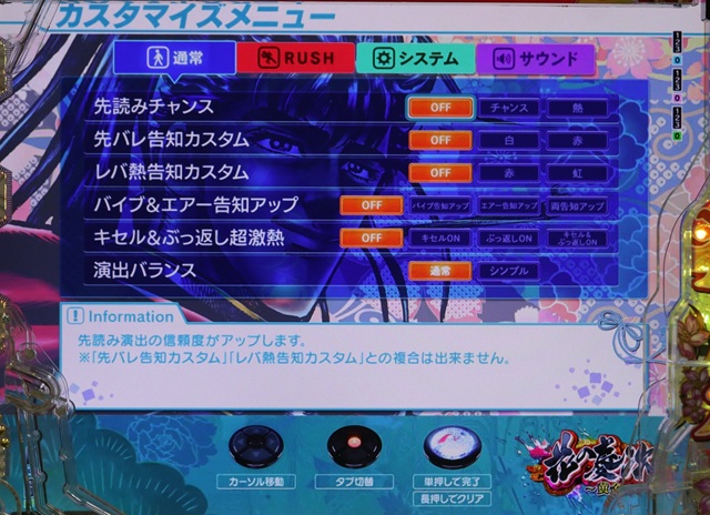 本機の演出カスタムは、通常時とRUSH中で4種類が共通。それぞれ限定のカスタムが2種類ずつ用意されています。「キセル&ぶっ返し超激熱」を「キセルON」にすれば、キセル発生=大当り<突入濃厚に!