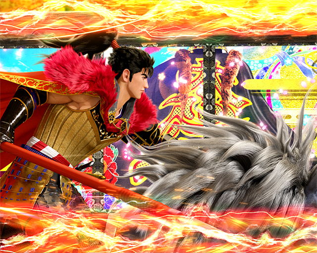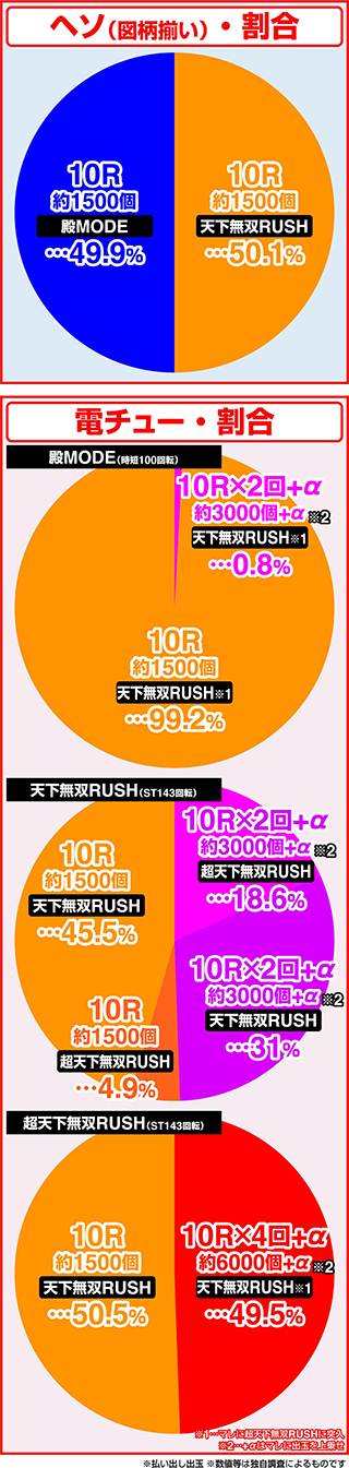 本機のLT「天下無双RUSH」は、ST143回転で継続率が約77%。出玉は50.4%が1500個、49.6%が3000個+αとなっています。そして大当りのうち23.5%が「超天下無双RUSH」に移行する、というのが最大の注目ポイント。こちらはいわば、天下無双RUSHの上位版といえるモードなんです。