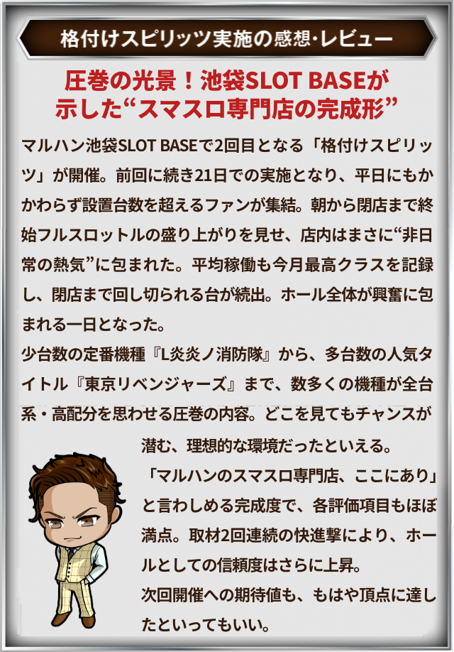 10月21日(火)マルハン池袋SLOTBASEにて、DMMぱちタウンの「格付けスピリッツ」を実施。