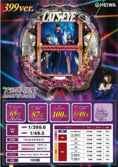 大当たり確率1/399.6、ST『CAT’S RUSH』と突入率65%、ST継続率87%のMAXタイプ「399ver.」と