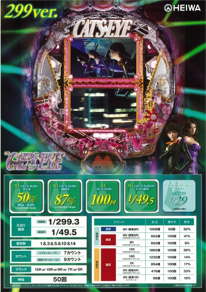 大当たり確率1/299.3、ST『CAT’S RUSH』と突入率50%、ST継続率87%のミドルタイプ「299ver.」の2スペックでの発売となる。
