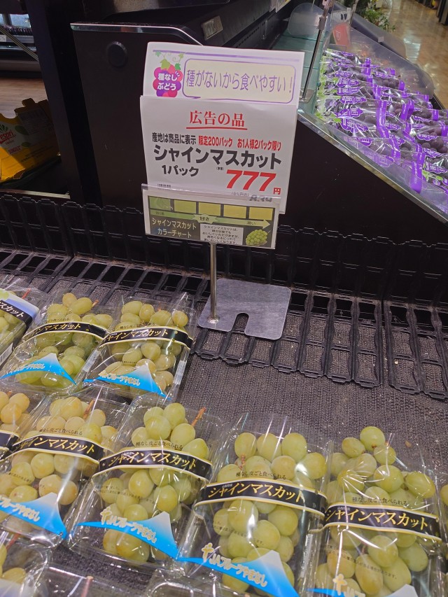 近くのスーパーで買い物してた時の話。スーパーに入るとまさかそこにあったのはマスカット一房777円!