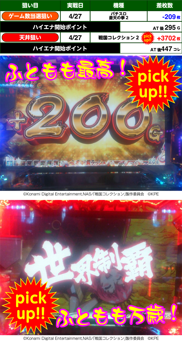 あっさりとATを抜けたため、閉店までは時間に余裕があったので、ホール内を物色していると、次に見つけたのが「戦国コレクション2」。キラキラありだったので確保したものの打つかどうか少し悩んだが、結局、移動しても今日はこれ以上の台を見つけられないと判断しハイエナ開始。
