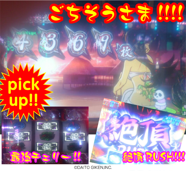 投資100枚ほどでボーナスを獲得。やっぱり据え置きでしたね。そして何も引いてないのに頂ラッシュ! 帰る準備をしていたところだったので本気で驚いた。これで、この台でのプラス収支がほぼ確定したので、気軽な気持ちで打ち出すと上乗せが止まらない。最強チェリーや絶頂RUSHも引くことができ、なんと2日続けての4000枚オーバー! 気負わないといい結果が出るのはスポーツもパチスロも同じみたいです。メンタル…大事。