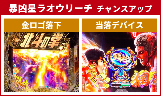 信頼度約89.9%を誇る本機最強リーチで、プレイヤーがケンシロウorラオウのどちらかを選択できる(実戦ではケンシロウを選択)。チャンスアップは金ロゴ落下と当落デバイスの2つあり、いずれもチャンスパターンが出れば大当り濃厚。実戦ではそれぞれ1回ずつ出現した。