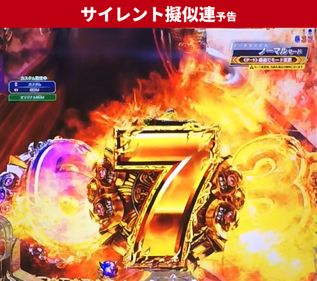 実戦で出現した連続予告は「サイレント擬似連予告」のみで、この予告自体も5回しか出現していない。演出は右に3図柄、中に7図柄(特定パターンで2図柄)が停止した後に再変動するというもので、演出や効果音などがないためしっかり見ていないと気が付きにくい。ポイントは停止図柄で、「173」と「573」なら信頼度80%以上、「623」は信頼度約98.7%、「473」や「673」などのそれ以外は信頼度約58.9%だ。実戦では高信頼度の「173」が1回だけ出現した。