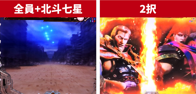全5種類あり、信頼度はVSサウザー(約27.8%)<VSシン(約40.0%)<VSユダ(約60.4%)<VSジャギ(約84.1%)の順で、VSアミバは大当り濃厚だ。実戦ではVSシンが11回出現と最も多く、次が9回出現したVSサウザーだ。