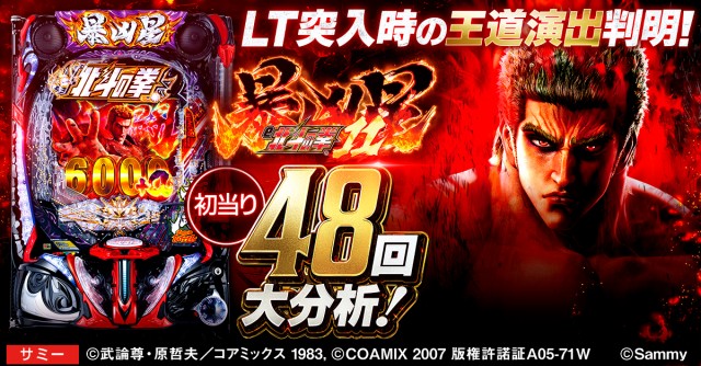 サミーの新機種『e 北斗の拳11 暴凶星』がホールに登場した。本機は『北斗の拳』シリーズ最新作で、さらに大ヒット機種『P北斗の拳 暴凶星』の遺伝子を色濃く継承したマシンだ。通常時図柄揃い確率は約1/399.8で、LT性能は突入率約61%・継続率約75%というLT特化タイプ。最大の特徴はLT中の出玉性能で、大当りの約50%が4500以上となっている。