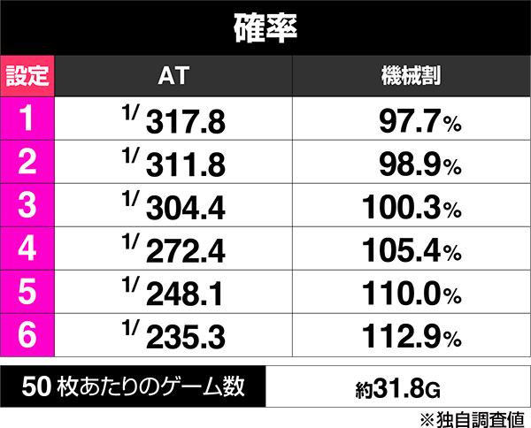 なお、機械割については設定6で112.9%。現役AT機では114.9%をマークする機種が多くあるのでそれには劣るが、設定5でも110.0%あるのはポジティブ要素。