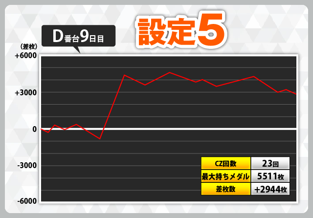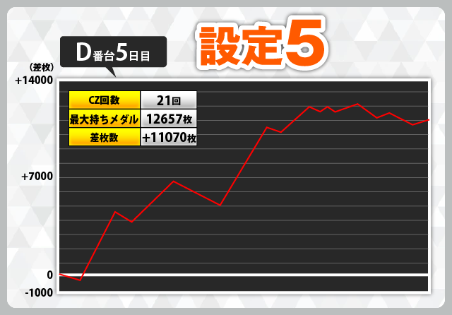 また、1台だけ使用された5日目D番台の設定5は、早い段階で出玉を伸ばし、その後も大きくヘコむことはなく+11070枚で1日を終えています。