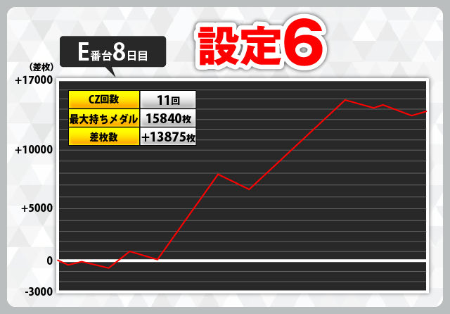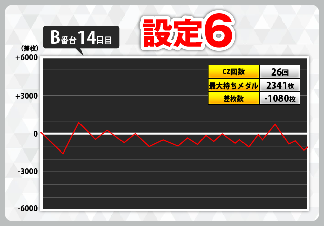 それでは2週目に使われた設定6を見ていきましょう。8日目のE番台(設定6)の+13875枚、11日目のD番台(設定6)が+6004枚、14日目B番台が-1080枚という結果。2台はしっかりと大勝したものの、もう1台はわずかながらマイナスになってしまいました。