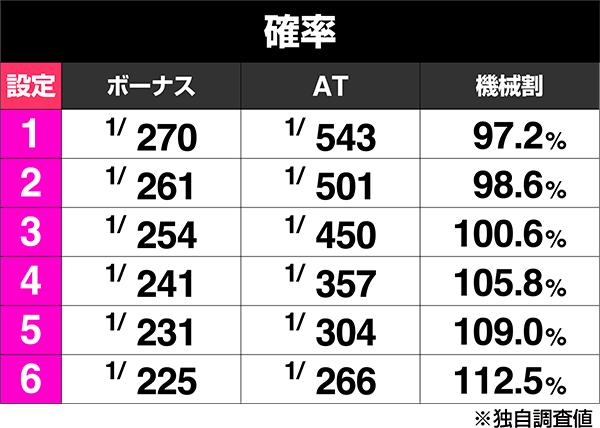 まずはボーナスとAT初当り確率をご覧いただこう。どちらも高設定ほど確率が高くなっているが、特にAT初当りに関しては設定差が顕著なため、高設定か否かは正直に言ってこのAT初当りを見ておけばある程度判断できる可能性はある。