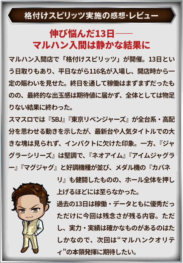 11月13日(木)マルハン入間店にて、DMMぱちタウンの「格付けスピリッツ」を実施。