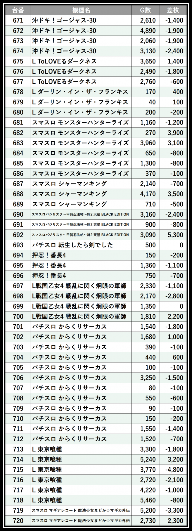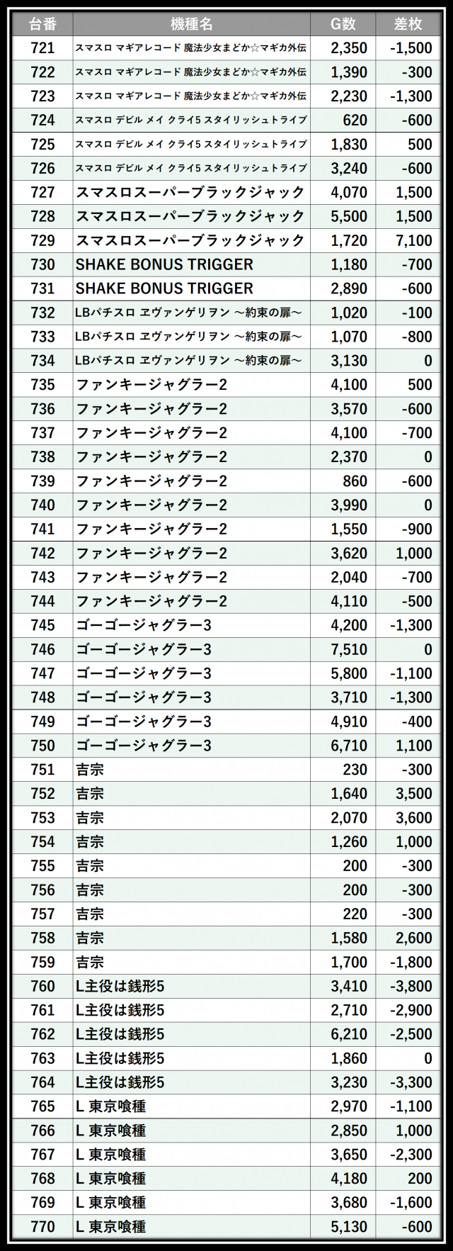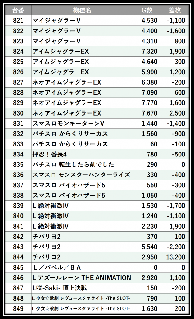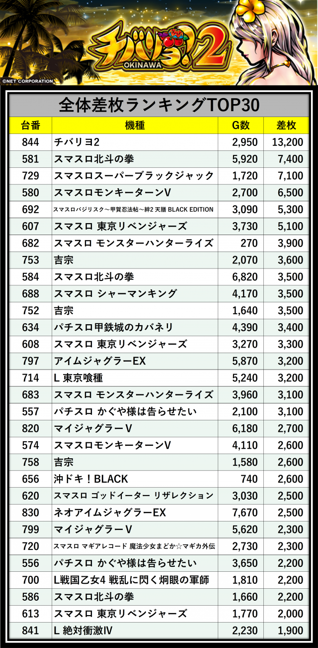 ※差枚数順に掲載しています