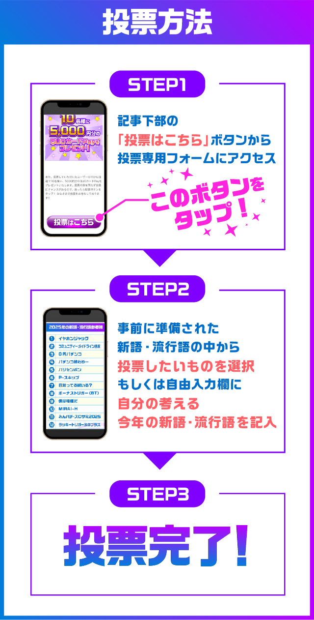 新語・流行語大賞の投票は、この下にある【投票はこちら】をタップするとアクセスできる投票フォームから可能です。