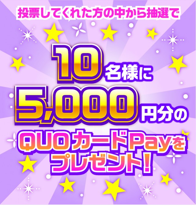 また、投票していただいたユーザーの中から抽選で10名様に、5000円分のQUOカードPayをプレゼントいたします。投票内容やランキングは問わず全員にチャンスがあるので、迷ったら投票ボタンをタップ! みなさまの投票をお待ちしております!!