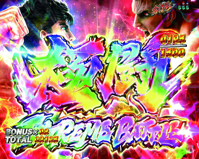 LT中にケンシロウ(拳王RUSH中)、もしくはラオウ(救世主RUSH中)が登場すれば、「極闘 EXTREME BATTLE」突入の大チャンス。極闘はVストックをかけたBATTLE BONUSで、最低でも6000個、最大で12000個の出玉を獲得することができます。