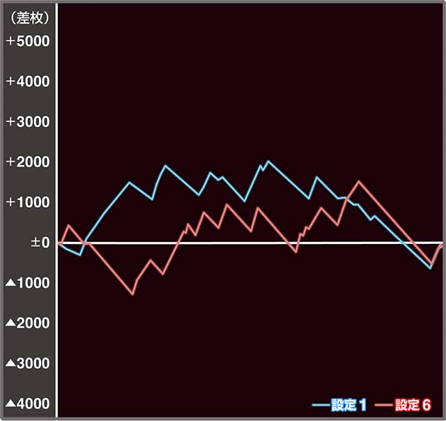 グラフの刻み方に多少の差はあれど、結果的には設定1と6で似たようなスランプグラフとなりました。