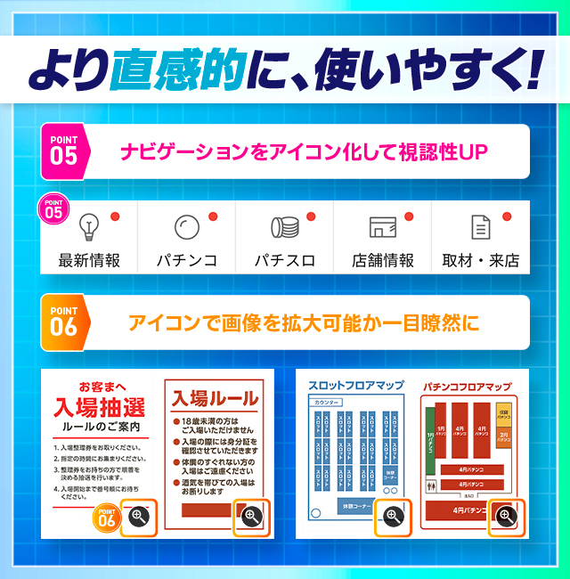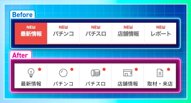 「最新情報」「パチンコ」などのページ内ナビゲーションに、電球や銀玉のアイコンが加わり、どんな情報が見られるのかが視覚で丸わかりに!