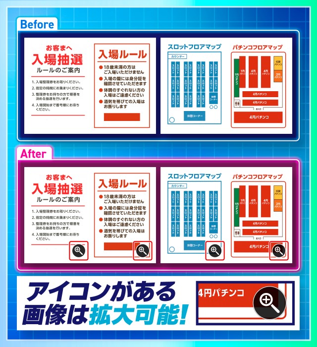 それらが拡大できるかどうか、今までは画像を押してみるまでわかりませんでしたが、今回のリニューアルにより、拡大できる画像の下部に虫眼鏡アイコンを追加。
