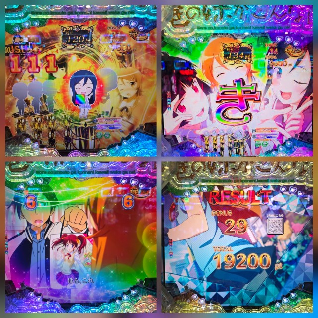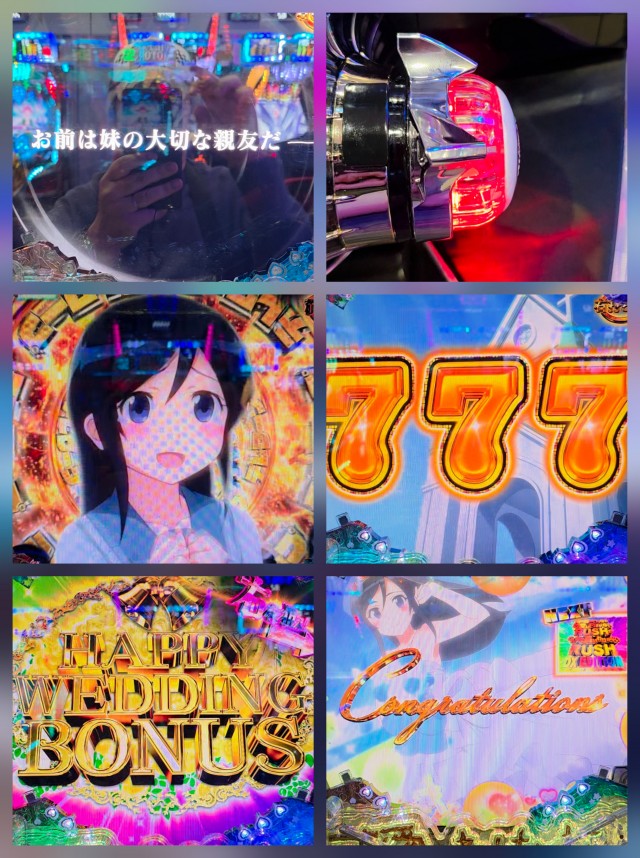 『P 俺の妹がこんなに可愛いわけがない。』にて、ラッシュ画面割れから虹ギミック演出で至福のラッキートリガー突入ですねん! LT中の大当り消化後に虹カットイン発生で保留連確定のVストックをゲット! LT 右打ち中の暗転からPフラ発生で7揃い、ハッピーウェディングボーナスから大量出玉と共にCongratulations をゲットですねん! LT 右打ち中に虹保留、虹・すき文字、レバブル予告で虹演出、そして最終的に一撃29連19200発超えをゲットですねん! (モンちゃんさん)