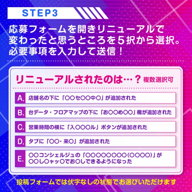 リニューアルでどこが変わったのか違いを探し、5択クイズにチャレンジして応募するだけ。