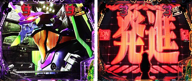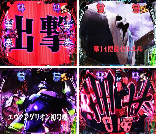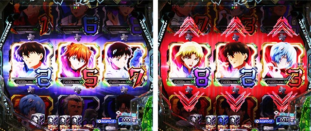 エヴァ各機の登場やリーチ後背景予告から図柄が揃う。そのタイミングは多種に及ぶ。