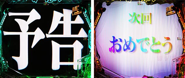 通常時の金パターンは信頼度が跳ね上がる。赤は発生する予告やチャンスアップにより千差万別だが、ST中ではアツい事例が多く見受けられる。虹はどんな場面でも超激アツ!