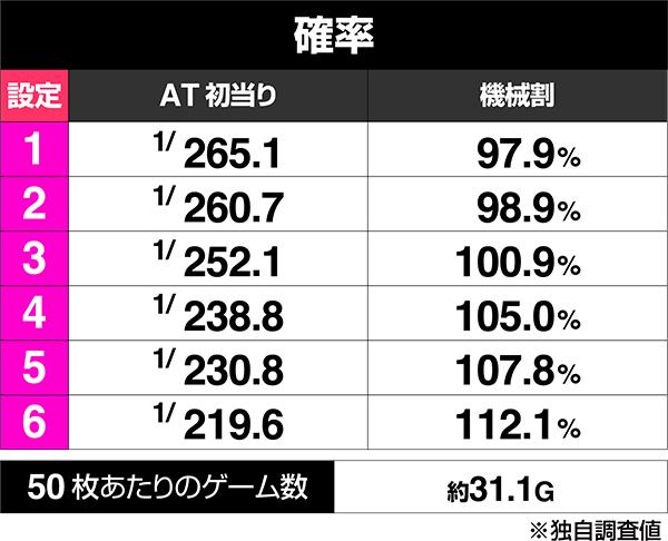 スペックはご覧の通り。現役機種と比べてもかなり当たりやすい部類に入るAT機と言っても過言ではないだろう。とはいえ、初当り確率に設定差はあるので、必ず気にしておくようにしたい。