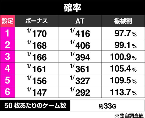 まずは簡易スペックをチェック。初当りのボーナス・ATともに設定差ありとなっているが、特に初当りAT確率には大きな差が生じている。
