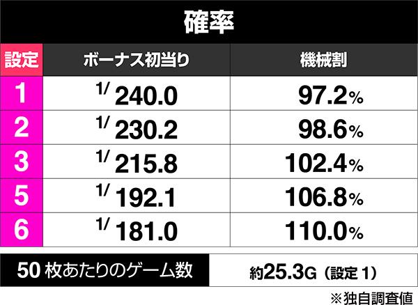 設定は5段階。シリーズ最高峰の初当り確率となっていて、設定1でも240分の1までアップしている。