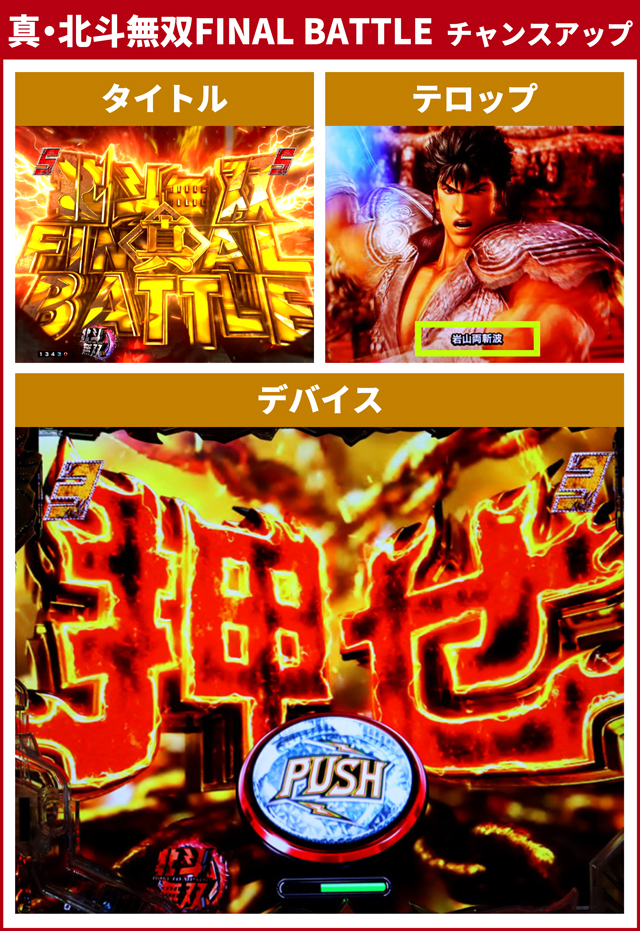 トータル信頼度約96%の本機最強リーチで、実戦では7回出現。チャンスアップは上の写真の3つで、タイトルとデバイスは通常パターン以外なら大当り濃厚。テロップは赤なら信頼度約95%で、金なら大当り濃厚だ。実戦ではすべて通常パターンで大当りしている。