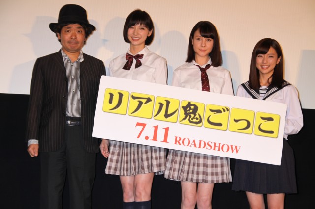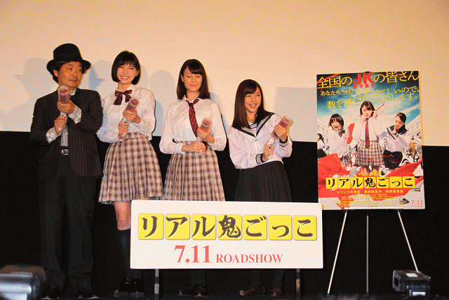 その後、来週7月11日(土)から封切される園子音監督の映画作品『リアル鬼ごっこ』の挨拶として園子音監督、トリプルヒロインとしてJK(女子高生)役を演じたトリンドル玲奈さん、篠田麻里子さん、真野恵里菜さんが登壇。