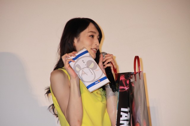 挨拶では園子音監督が「ネタばれに注意して」と言うと、3人は言葉を選びながらも明るい表情で答え、キックボクシングを習ったという篠田麻里子さんは「アクションの大変さと難しさを知り、勉強になった」と答え、トリンドル玲奈さんは試写後に泣いてしまったというエピソード、真野恵里菜さんは走るフォームがおかしいという指摘を受けた事など各々のエピソードを披露。最後には、園子温監督と共にトリプルヒロイン揃い踏みでバズーカの祝砲を景気良く打ち放し、舞台を後にした。余談だが、出演者は全員女性とのこと。撮影中は、園子音監督はさぞ楽しかったに違いない。