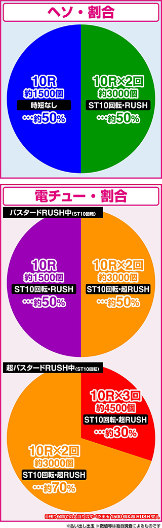 RUSHはSTタイプで突入率約50%&継続率約75%。超バスタードRUSHに入れば、上乗せ含めて最大10500個獲得の可能性もあり、とっても魅力的な出玉性能となっています!