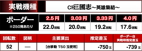 新台を中心とした実戦機種の候補のなかで、まず最初に確保したのは「CR三國志〜英雄集結〜」。稼働が上がってくると移動も難しくなるので、とりあえず台の確保後はすぐに実戦開始する。