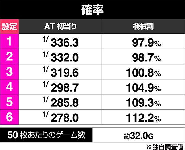 AT初当り確率は336.3分の1~278.0分の1。設定差はあるものの、そこまで大きく差がついているわけではない。