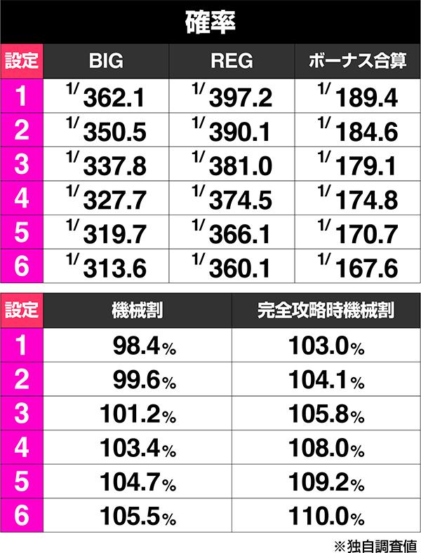 スペックは上の表の通り。完全攻略時は設定1からでも103.0%という甘さが際立つが、ボーナス確率で言うとBRともにそこまで設定差がついているわけではない。