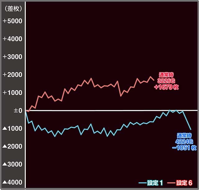 対する設定6は安定したプラス域のスランプグラフになっています。この後も消化できたとしてREGが収束してくれば、さらに安定したグラフになりそうかなと言ったところですかね。
