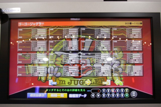 さらに、中央の通路端にはタッチパネル式の液晶端末が用意され、各台の状況も一目でわかる。