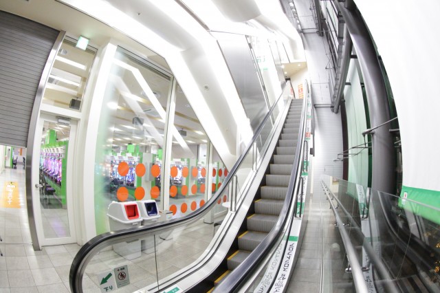 2階には根強い人気のMAX機、ミドル機が4円で勢揃い。ちなみに1階から5階までの地上部分は、開放感のあるガラス張りのエレベーター同様、解放感のあるエスカレーターで移動が出来る。
