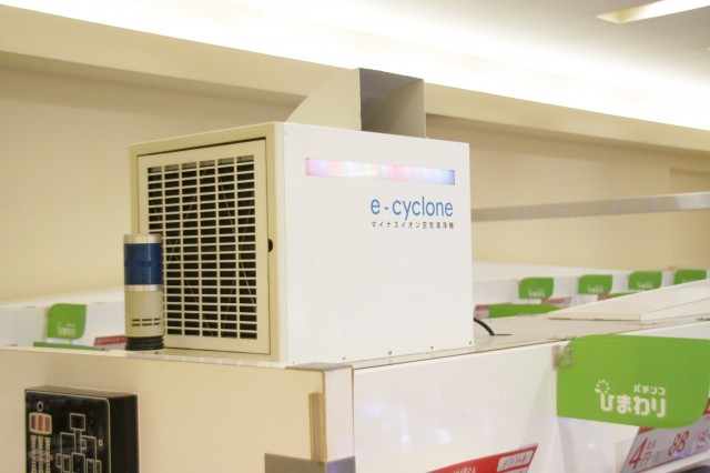 上:マイナスイオン空気清浄機e-CYCLONE(イーサイクロン)。空気より質量の軽い埃やタバコの煙をキャッチする