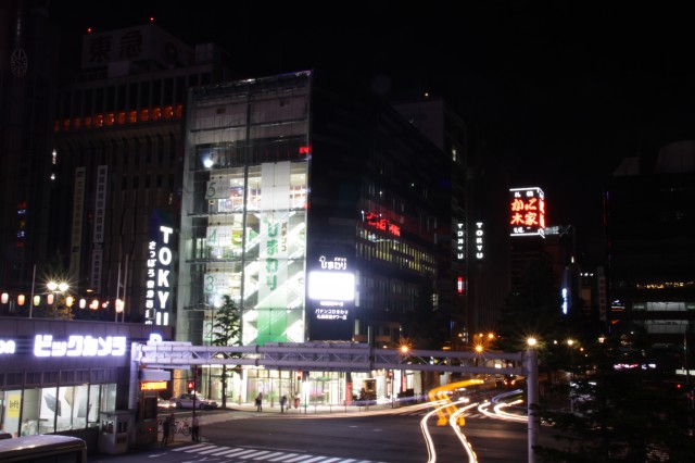 23:00、 閉店後のひまわり。駅前だけに、深夜でも交通量は多い