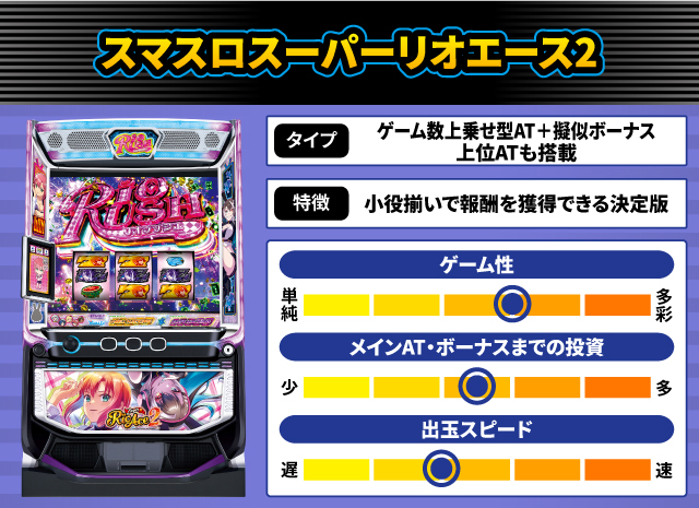 一方で比較的マイルドなAT機が『スマスロスーパーリオエース2』だ。あの人気キャラクター・リオだけがウリではない。AT初当りを高めに、そしてAT中の上乗せ(報酬)チャンスも高めに設定されており、プレイヤーが成功体験を得られやすい、まさに遊技機の鑑と言うべきゲーム性に仕上がっている。