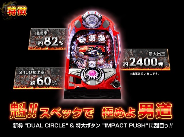 スペックは男気溢れる?MAXタイプ1/399.61、ST突入率約70%、継続率約82%、最大出玉2400発と新筐体「DUAL CIRCLE」のインパクトを引っ提げて8月17日(月)にホールに登場予定。